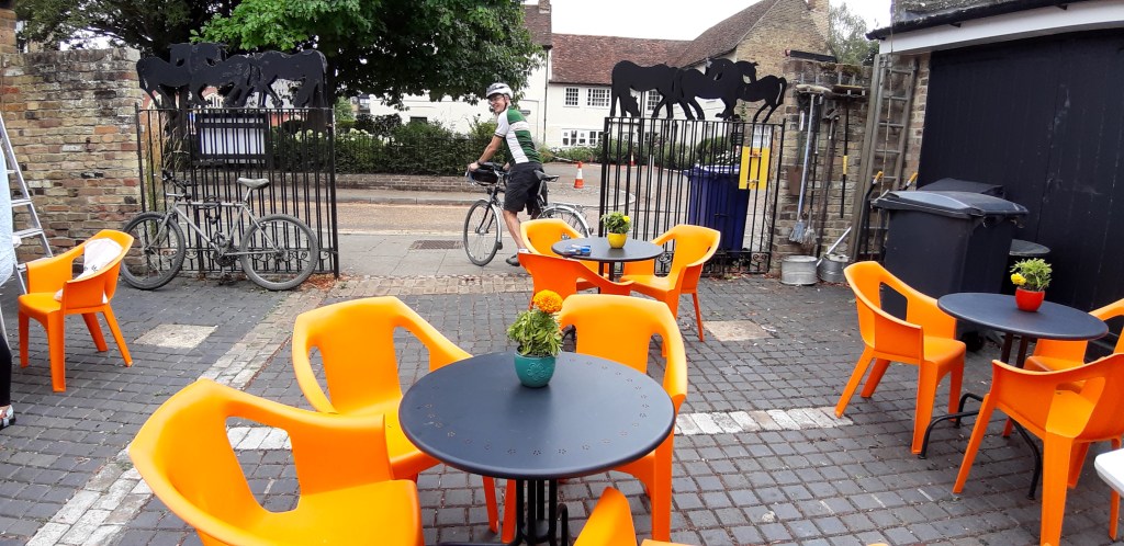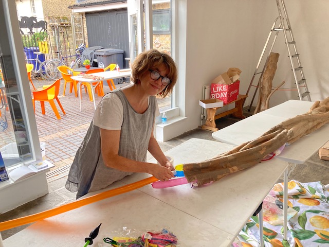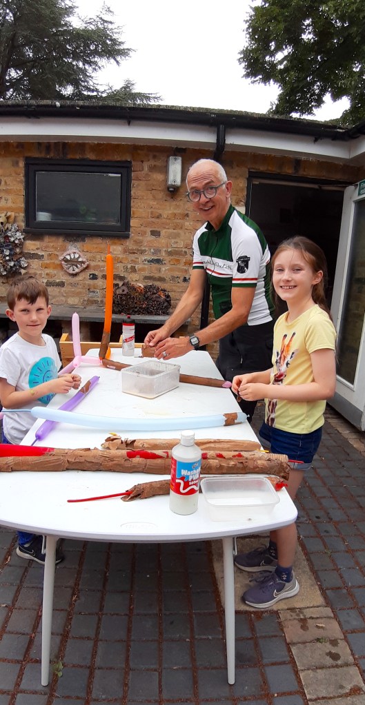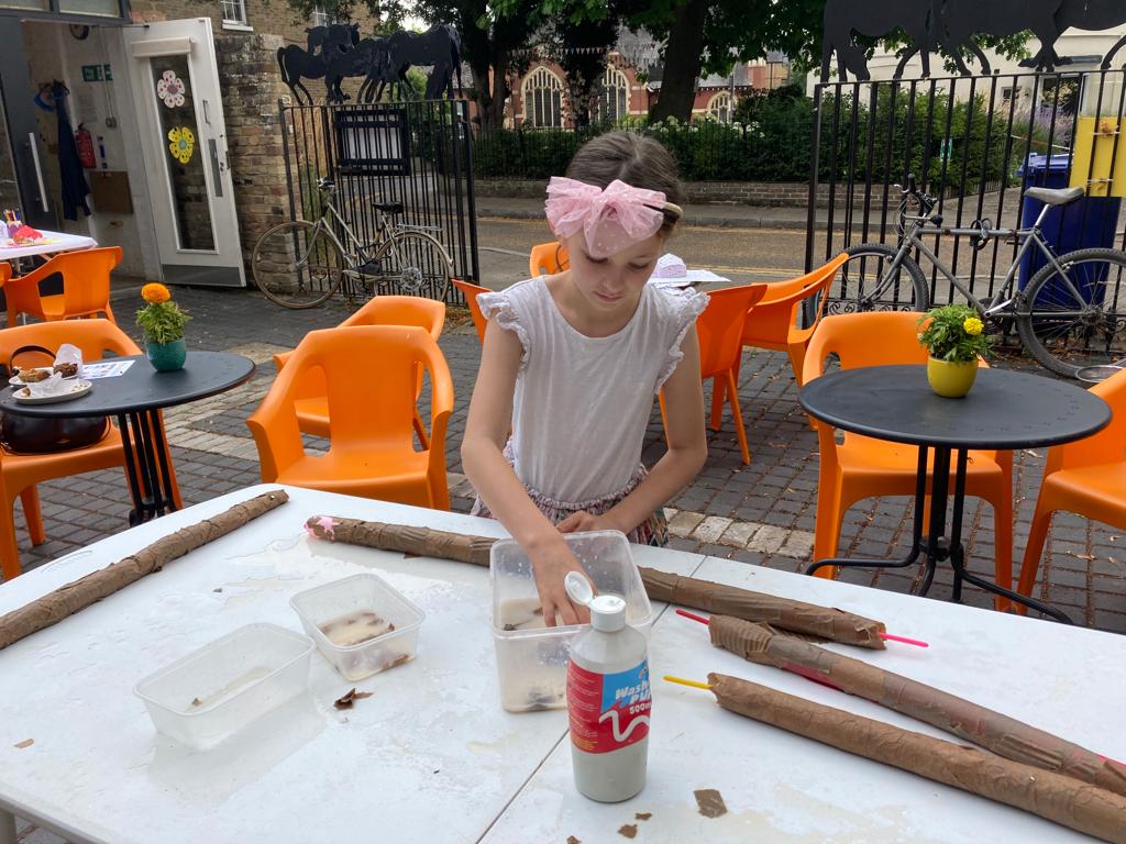 I had a surprise visitor at 2 o’clock: Ben rode up on his bike, having covered most of the 22 miles between here and home on disused railway lines. I was able to introduce him to some of my new acquaintances and show him first hand why I was having such a great time. After replacing his calories with a bag of chips from around the corner and a coconut and lime cake from the Courtyard Arts café, he got stuck into helping, and then introducing other children into mâché techniques (it’s like a domino effect).