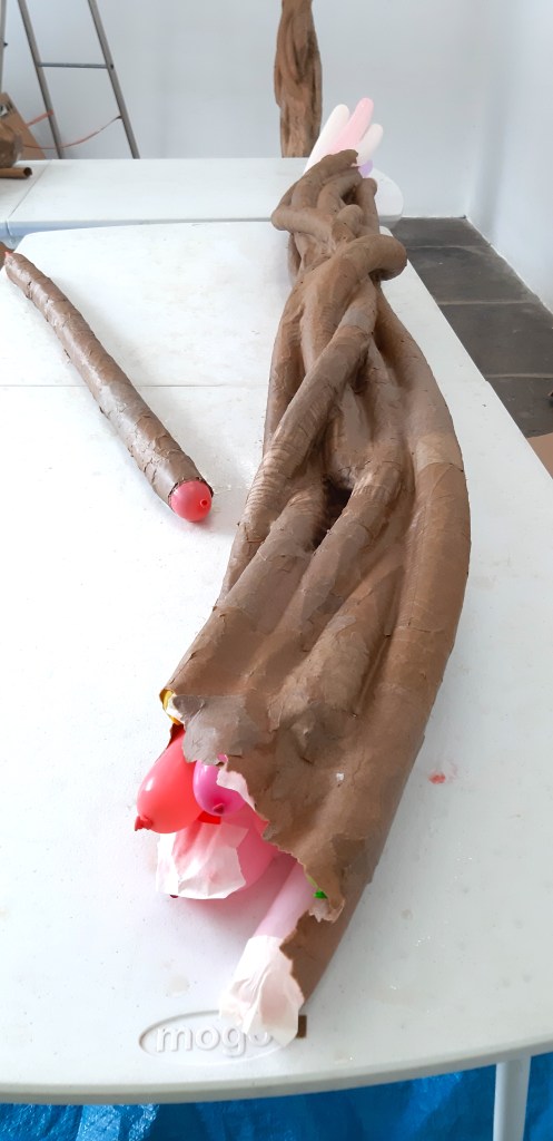 I’m feeling much more relaxed and in control today because, as you can see, one of the taproots has become vertical and I’m beginning to believe that the installation can work. The Courtyard Arts technician, Chris, came to help me in the morning; his experience, expertise and can-do attitude meant that within an hour, the three and a half metre horizontal was upright. It is only supported by the ground and by the fact that it is resting within the window cavity, but it’s fairly rigid and will stay firm (unless someone pushes it quite hard).