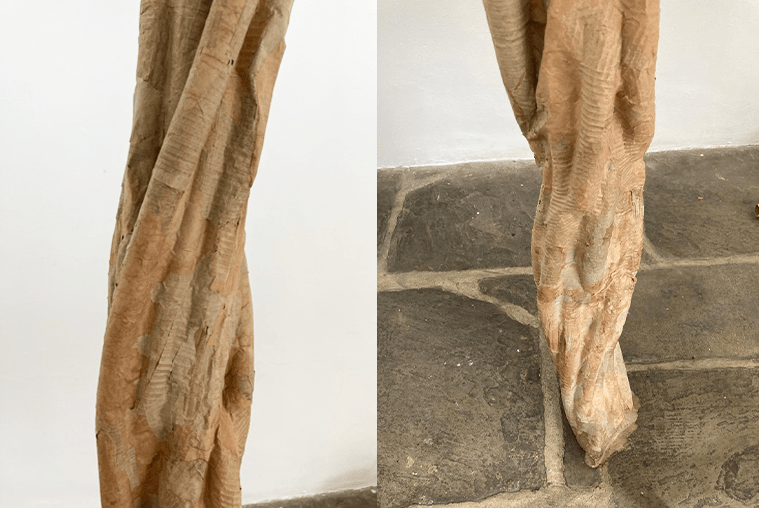 Things looked up when Chris arrived again and the second taproot became vertical like the first. It’s attached in a different way – it’s actually hung from screws on a joist using fishing twine. I then had to slit it down the middle in order to pull the stuffing out; I had to get my hand right up inside there, and Chris said I looked like a vet.