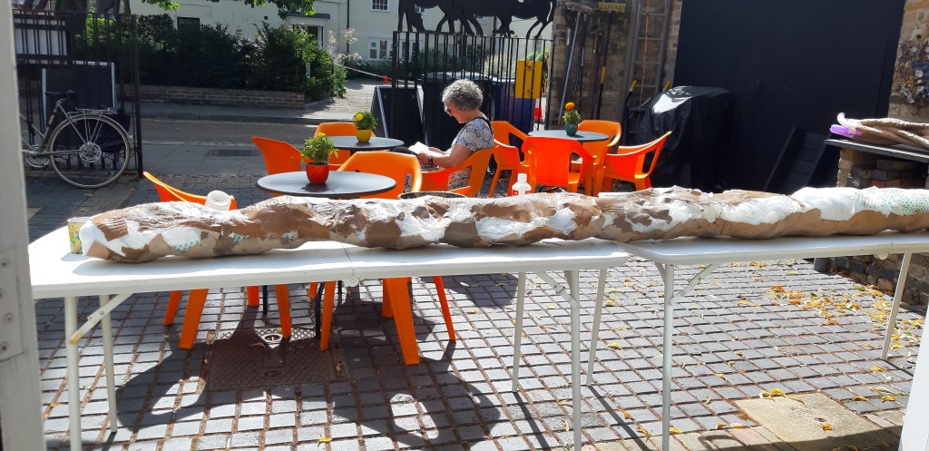 It was a quiet day at Courtyard Arts today; no classes going on, and only a few passing visitors. Working outside in the sun, I finished covering the pillow-stuffing taproot and it dried quickly. I had a long chat with Liz, the morning steward, about the climate and Extinction Rebellion (of which she is a member). Our politics aligned, and we both admire George Monbiot hugely. I will join Liz’s XR group (North and East Herts) in September for a demonstration in London. We agreed that our main hope for the climate lies with the momentum, motivation and anger of the young generation – those that will bear the brunt of years of apathy. That doesn’t mean we do nothing of course. The North and East Herts XR team is made up of menopausal women! Up with menopausal women!