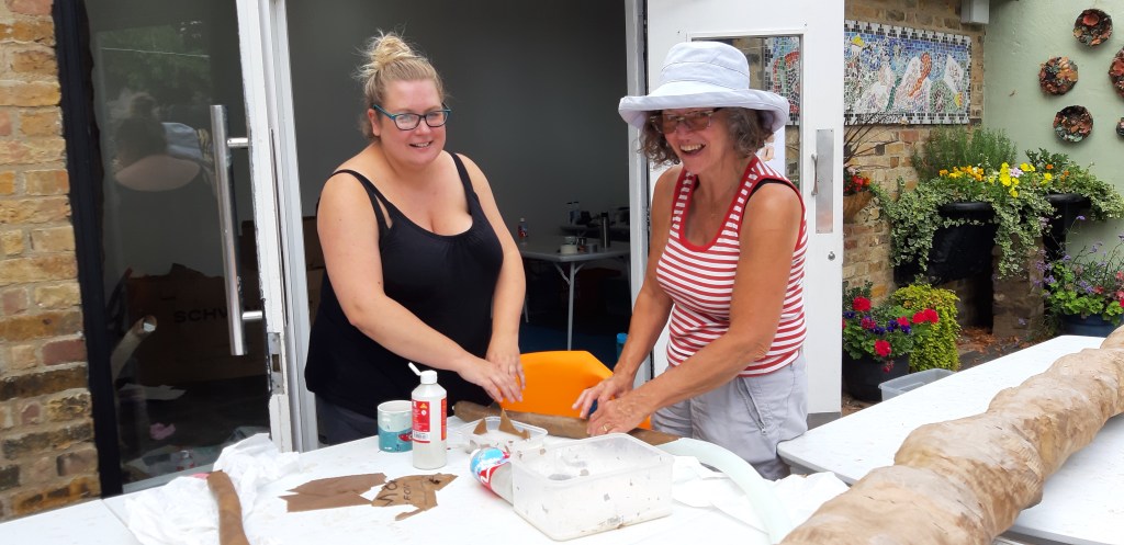 Laura and Sandra making a snakey tendril (Sandra finds it very therapeutic)