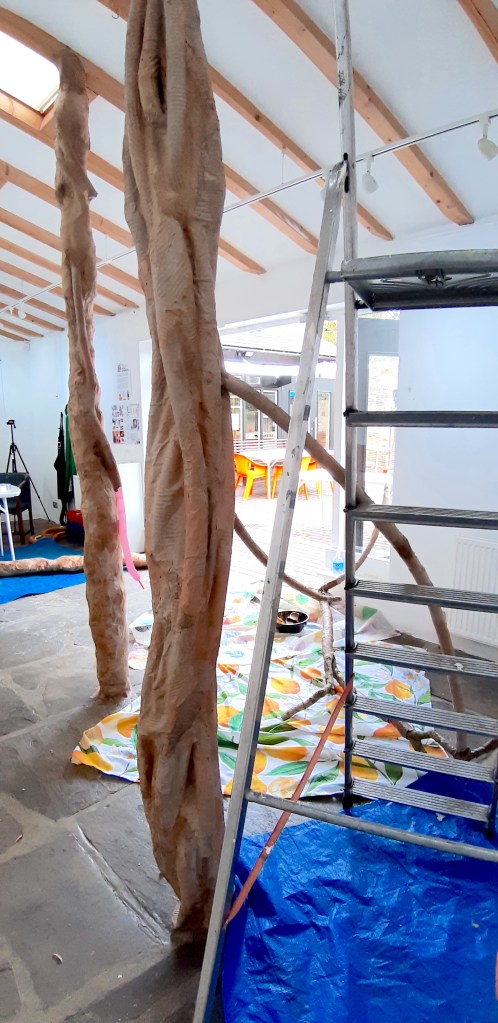 After covering the taproot, I wanted to honour our tree in some way, so I cleared the end of the gallery completely and started to incorporate the tree’s branch which I had brought from home. It was an excellent base for the snakey tendrils to emanate from – I fitted them together like a child’s toy and starting making connections with them. It was extremely satisfying!
