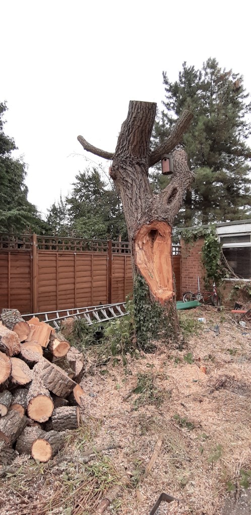 Coming home, I was feeling apprehensive. There was a strange lightness around the house, as if the sea were the other side of it. In the back garden, only the maimed trunk of the tree remained, and around it all its limbs in a pile of discs. The garden looked ordinary, without depth or complexity. The field at the back looked too near. There was a harsh bright light on the ugly outbuilding, normally softened by branches and dappled shade. We have lived for 21 years loving that tree and eating meals under its protection – and many others enjoyed it for decades before us. However, it is still alive and will sprout shoots, and perhaps will enjoy not having the burden of its heavy branches.