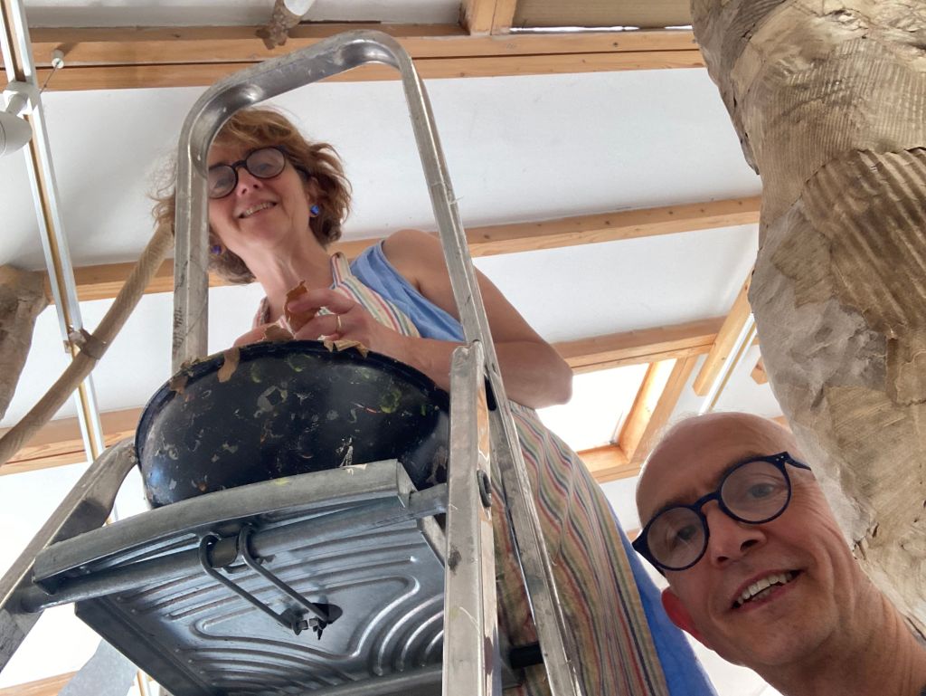 It’s the end of week 3 already! Today felt quiet and unofficial. Laura, the centre director, and Barbara were not there; there was only a steward in the morning (the afternoon steward was stuck in her motor home somewhere near the M4), so the place was closed to the public in the afternoon; and there were no visitors except for people who were here yesterday for the workshop and had come to remove the clay from within their Strange Beings. Also, Ben came with me for moral support in all the roof-work which needed completing, which gave the day a holiday atmosphere.