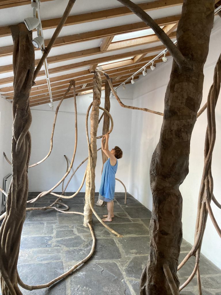 At 4.30pm, if I hadn’t felt quite so hot and tired, and worried about my friend Sally-Ann who fell downstairs yesterday, I would have felt elated because the whole gallery installation is complete. The only thing left to do next week is grow the snakey tendrils through the windows and walls to colonise the courtyard. And to give the exhibition a name – I shall be contemplating that over the next few days.