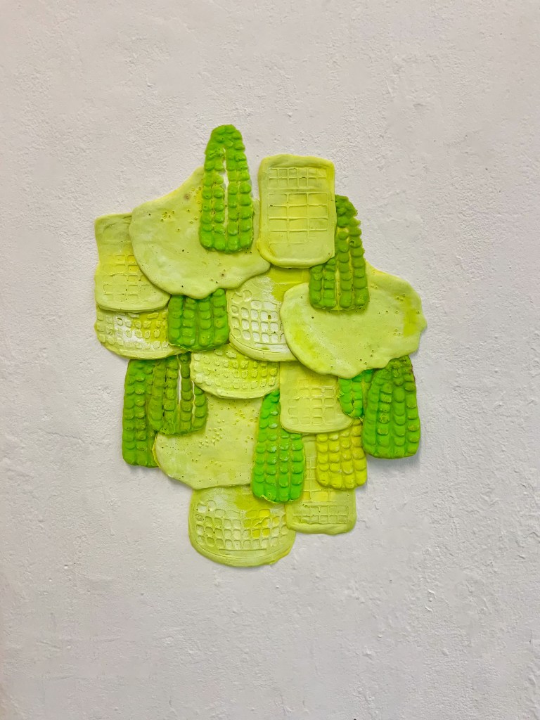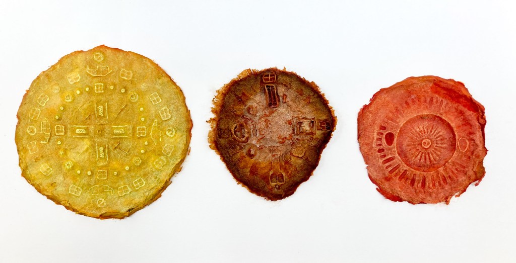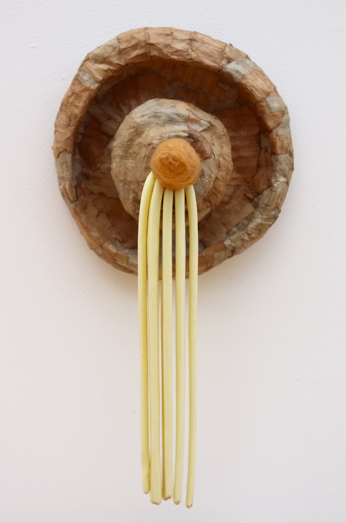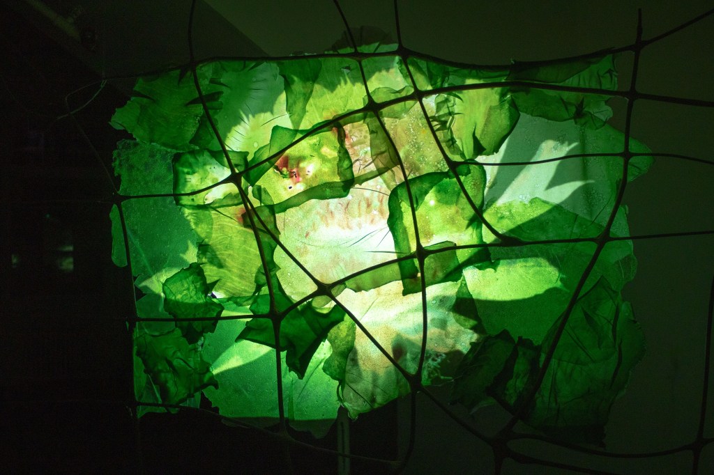 Biomaterials made of agar agar, food dye, vegetable glycerine and sheep’s wool. Poured into moulds and dryed in a dehydrator.